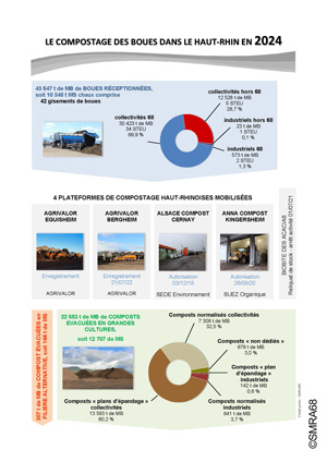 Les sites de compostage constituent des installations essentielles à la filière locale de retour au sol de produits résiduaires urbains et industriels. Dans le Haut-Rhin, 6 sont habilités à recevoir des boues, mais seuls 4 le font effectivement.